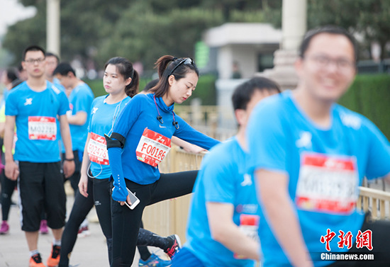 賽前跑友做準(zhǔn)備活動 中新網(wǎng)記者 李卿 攝