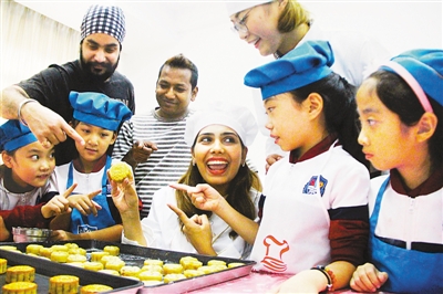 中秋節(jié)之際,河北唐山市豐潤區(qū),來自英國、印度、孟加拉國的外教老師與當(dāng)?shù)氐暮⒆觽円黄鹬谱髟嘛灒w驗(yàn)中華民族傳統(tǒng)文化。