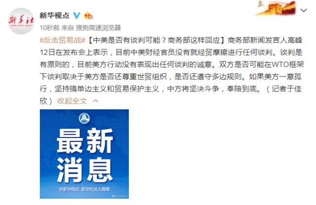 【中美是否有談判可能?商務(wù)部這樣回應(yīng)】商務(wù)部新聞發(fā)言人高峰12日在發(fā)布會(huì)上表示,目前中美財(cái)經(jīng)官員沒(méi)有就經(jīng)貿(mào)摩擦進(jìn)行任何談判。談判是有原則的,目前美方行動(dòng)沒(méi)有表現(xiàn)出任何談判的誠(chéng)意。雙方是否可能在WTO框架下談判取決于美方是否還尊重世貿(mào)組織,是否還遵守多邊規(guī)則。如果美方一意孤行,堅(jiān)持搞單邊主義和貿(mào)易保護(hù)主義,中方將堅(jiān)決斗爭(zhēng),奉陪到底。(記者于佳欣)