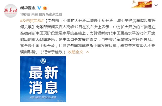 【商務(wù)部:中國(guó)擴(kuò)大開(kāi)放舉措是主動(dòng)開(kāi)放,與中美經(jīng)貿(mào)摩擦沒(méi)有任何關(guān)系】商務(wù)部新聞發(fā)言人高峰12日在發(fā)布會(huì)上表示,中方擴(kuò)大開(kāi)放的舉措是在準(zhǔn)確判斷中國(guó)現(xiàn)階段發(fā)展水平的基礎(chǔ)上,為引領(lǐng)新時(shí)代中國(guó)更高水平的對(duì)外開(kāi)放做出的重大戰(zhàn)略決策,是中國(guó)自身發(fā)展的需要,與中美經(jīng)貿(mào)摩擦沒(méi)有任何關(guān)系。完全是中國(guó)主動(dòng)開(kāi)放,讓世界各國(guó)都能搭乘中國(guó)發(fā)展快車,希望美方有些人不要誤判形勢(shì)。(記者于佳欣)