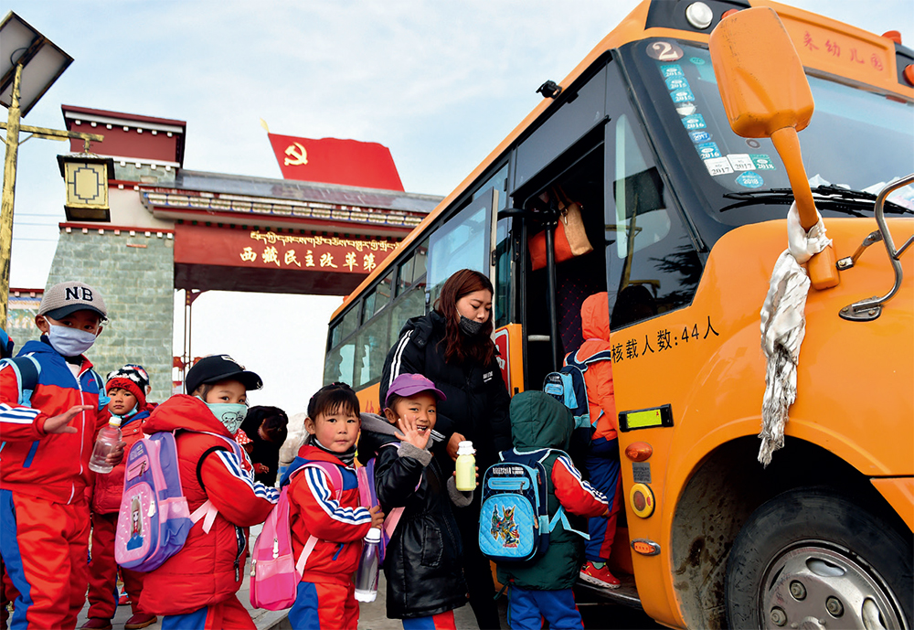 2018年3月27日,“西藏民主改革第一村”克松社區(qū)的孩子們登上校車出發(fā)去幼兒園 覺果攝