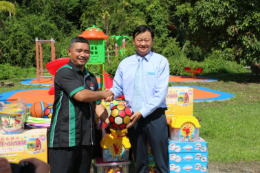 陳紅科(右)代表中國建筑文萊淡布隆跨海大橋項(xiàng)目向文萊淡布隆區(qū)捐贈體育設(shè)施。資料圖