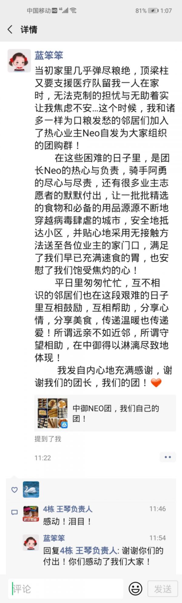物業(yè)和社區(qū)都很支持李磊他們的工作,物業(yè)一位負(fù)責(zé)人表示,因?yàn)榱憬佑|配送,減少了人員外出和流動(dòng),整個(gè)小區(qū)很早就實(shí)現(xiàn)了新冠肺炎患者零增加!