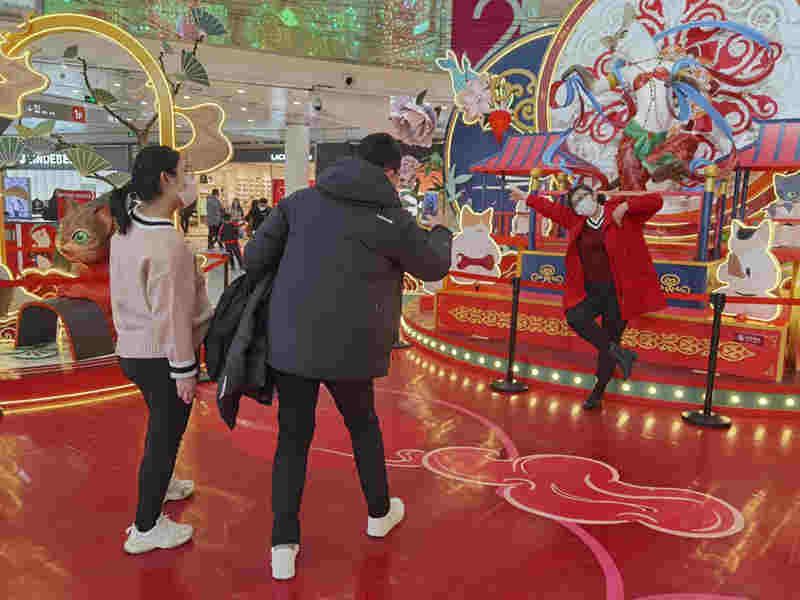 春節(jié)期間,在位于北京市朝陽(yáng)區(qū)雙井街道的某商場(chǎng)內(nèi),一家三口佩戴口罩悠閑游逛。在商場(chǎng)中心位置的特色展臺(tái)前,阿姨擺出跳舞的姿勢(shì),難掩口罩下綻放的笑顏,家人趕忙用手機(jī)記錄下她的美好心情。