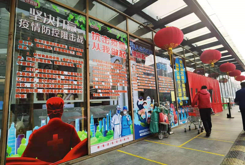 北京市朝陽(yáng)區(qū)京客隆超市(甜水園店)的玻璃大門(mén)上,貼滿了“堅(jiān)決打贏疫情防控阻擊戰(zhàn)”“抗擊疫情從我做起”“進(jìn)入公共場(chǎng)所請(qǐng)佩戴口罩”等醒目標(biāo)語(yǔ)及五彩繽紛的宣傳圖片,與玻璃門(mén)上方充滿節(jié)日喜慶的大紅燈籠相映成趣。超市嚴(yán)格按照防范規(guī)定,消費(fèi)者需要先掃描健康碼、測(cè)量體溫后,再有序進(jìn)入超市。