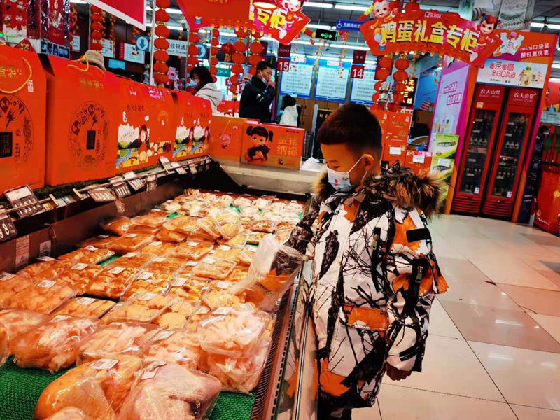 大年三十,超市內(nèi)充滿了節(jié)日的喜慶氛圍。一位小朋友手套塑料袋,正在學(xué)習(xí)如何在做好個(gè)人防護(hù)的情況下,安全購(gòu)買(mǎi)冷鏈?zhǔn)称贰?/p>