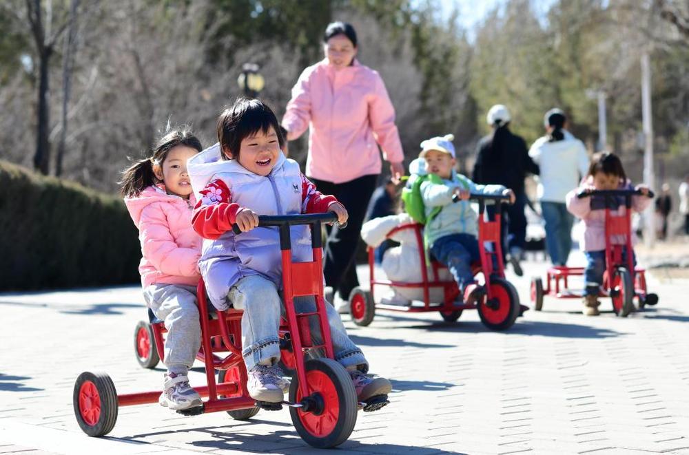 △2025年3月19日,在內(nèi)蒙古鄂爾多斯康巴什區(qū)一所托育園,老師陪伴孩子做體能游戲。