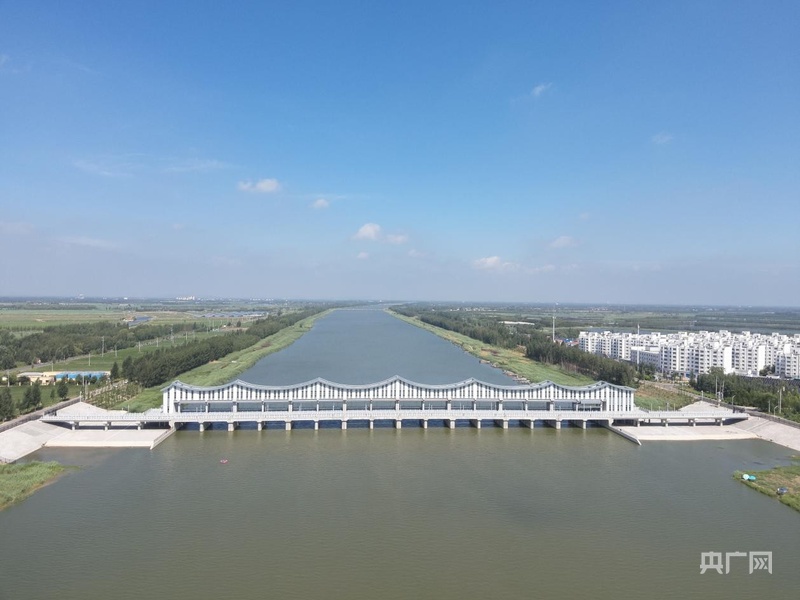 在濟(jì)寧市任城區(qū)喻屯鎮(zhèn),形似波紋的洙趙新河湖口節(jié)制閘矗立在水面上。(央廣網(wǎng)發(fā) 濟(jì)寧市水利事業(yè)發(fā)展中心供圖)