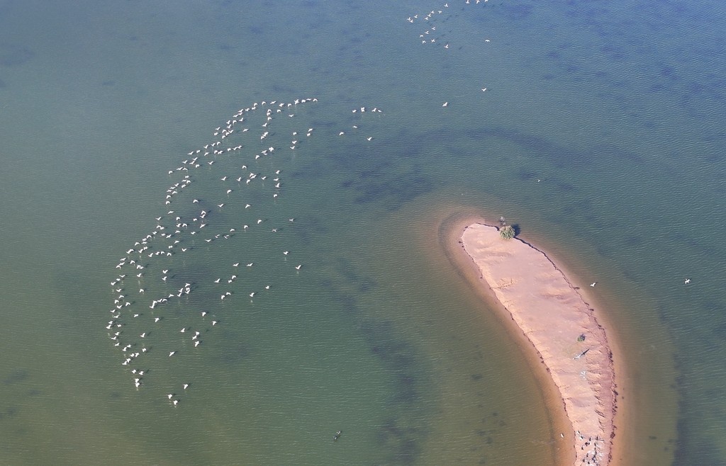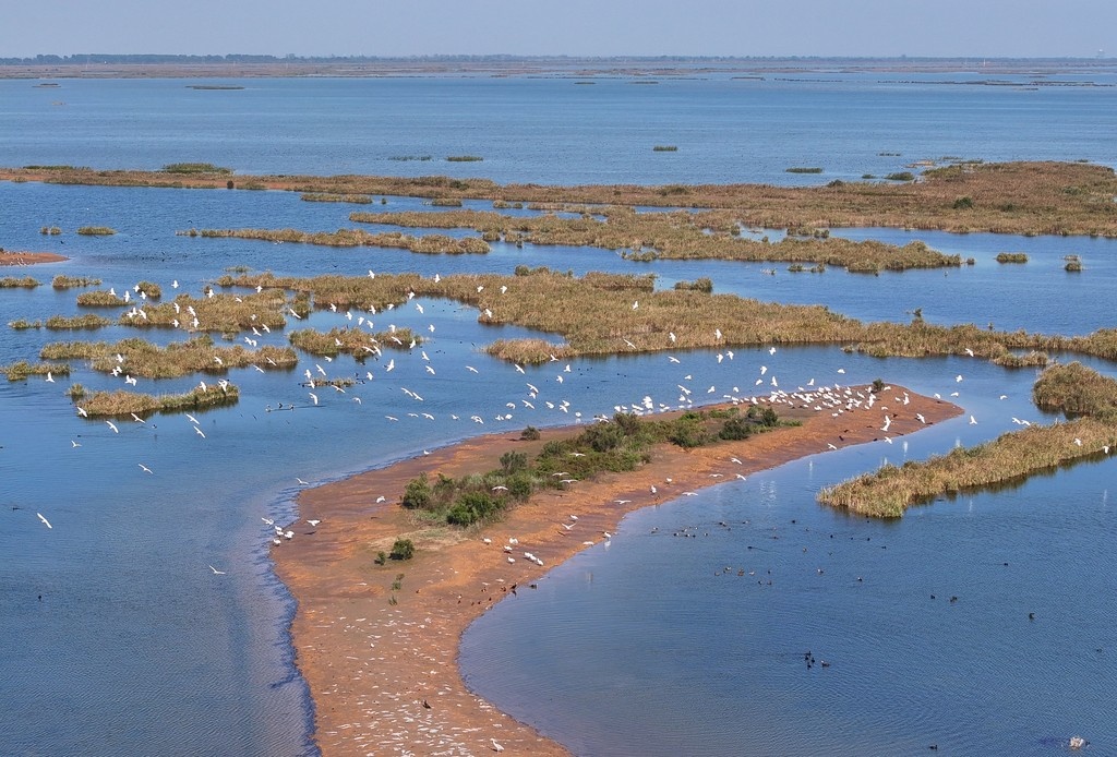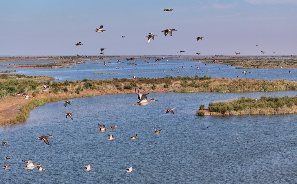 2025年10月13日,山東東營,在黃河三角洲國家級自然保護(hù)區(qū)濕地內(nèi),遷徙而至的候鳥或展翅飛翔,或游弋覓食。