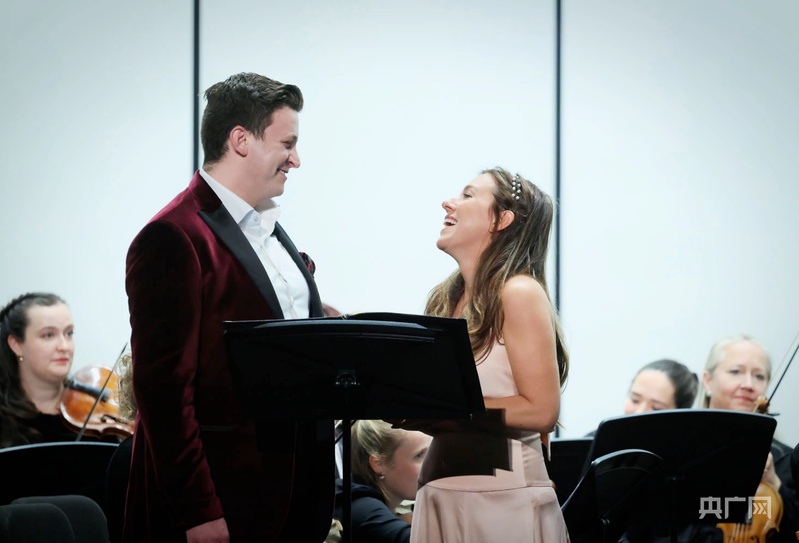 英國合奏團(tuán)藝術(shù)總監(jiān)、指揮哈里·畢克特,劇中男主里納爾多扮演者阿列·努斯鮑姆·科恩和女主阿爾米萊娜的飾演者瑪麗·貝文接受媒體采訪(央廣網(wǎng)記者 林馥榆 攝)