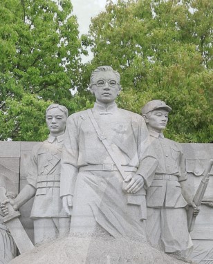 紀(jì)念館的廣場(chǎng)上有一面浮雕墻,上面記錄了外岡游擊隊(duì)的幾次重要戰(zhàn)斗。另一側(cè)的一組雕像,則再現(xiàn)了1939年1月30日下午日軍敵機(jī)墜落在外岡望仙橋附近,游擊隊(duì)聞?dòng)嵹s往現(xiàn)場(chǎng),在拆除有用部件后燒毀敵機(jī)的抗日事跡。