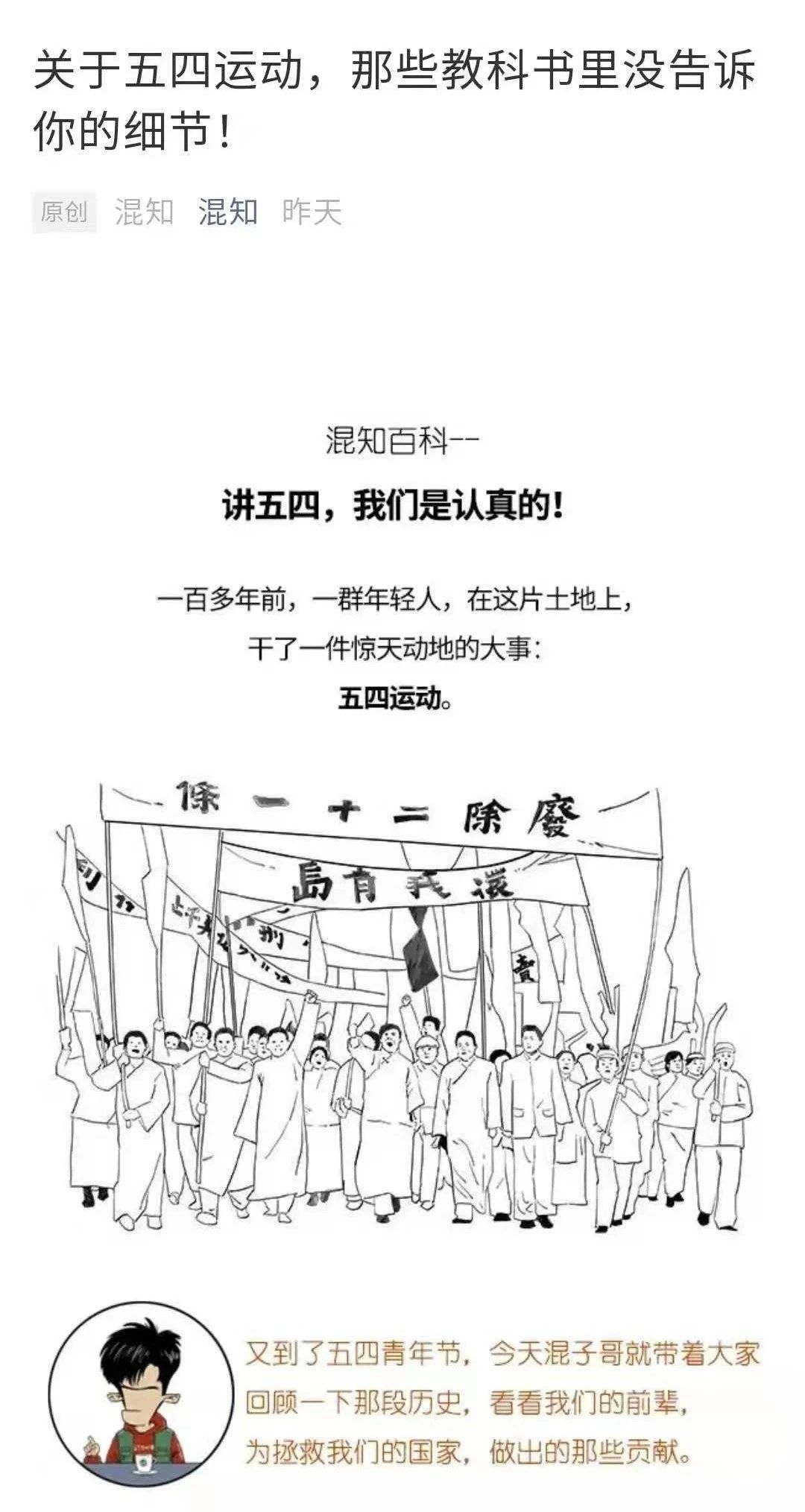 “一群心系國家的進(jìn)步青年成立了中國共產(chǎn)黨,并聯(lián)合無產(chǎn)階級(jí)開啟了新民主主義革命,拯救民族于危難之中……”5月4日,“混知”公眾號(hào)上發(fā)表的《關(guān)于五四運(yùn)動(dòng),那些教科書里沒告訴你的細(xì)節(jié)!》再次引發(fā)關(guān)注,閱讀量很快突破10萬!霸瓉砝畲筢、毛澤東、周恩來是上一個(gè)80、90后的前輩。同為80、90后的我們不能丟了他們的臉!”網(wǎng)友的留言印證了陳磊團(tuán)隊(duì)的價(jià)值,而“混子哥”也將在這條道路上繼續(xù)前行!