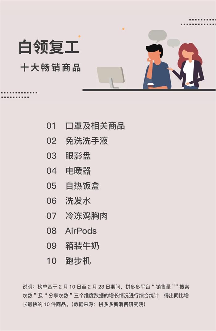 日前,拼多多對平臺消費(fèi)數(shù)據(jù)尤其是三線以上復(fù)工密集城市的消費(fèi)數(shù)據(jù)進(jìn)行了分析,得出“白領(lǐng)復(fù)工10大熱銷商品”榜單。其中,既有口罩及相關(guān)衍生品,又有自熱飯盒、眼影盤等解決吃和用的商品。