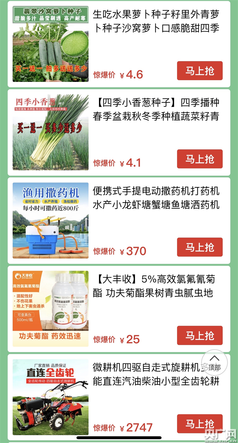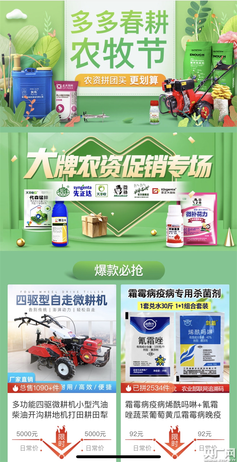 “春耕節(jié)”期間,在品牌直供的基礎(chǔ)上,拼多多還將對(duì)種子、化肥、農(nóng)藥等生產(chǎn)物資實(shí)施最低20%的平臺(tái)補(bǔ)貼,部分農(nóng)機(jī)農(nóng)具的補(bǔ)貼力度超過(guò)1000元(央廣網(wǎng)發(fā) 拼多多供圖)