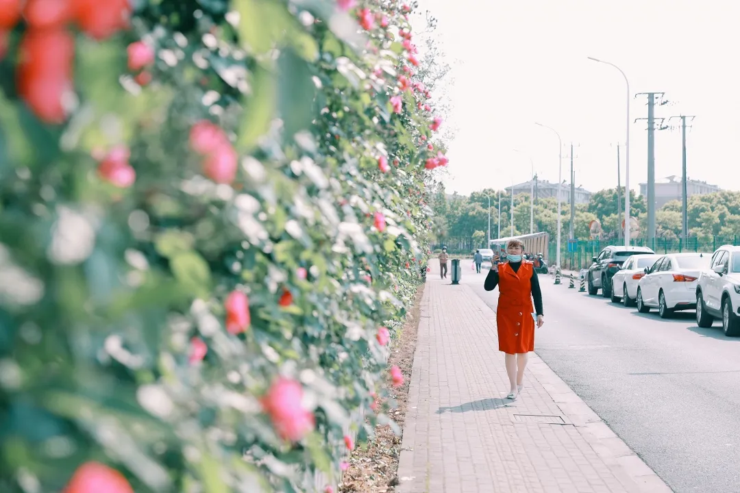 上海嘉定區(qū)外岡養(yǎng)老院門前的薔薇花墻長約200米,高約4米。朵朵明媚嬌艷的紅色薔薇花沐浴著陽光,倚著圍墻悄然舒展,層層疊疊的花瓣,將圍墻裝點得如詩如畫。光影交錯中,給整條路增添了一絲春日的浪漫氣息。