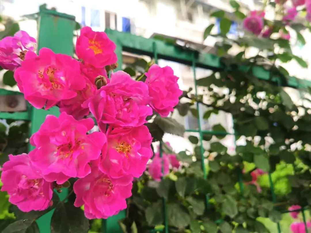 裕豐路兩旁開滿了淡粉色與玫粉色的“七姊妹”。它的花朵形狀較小,遠遠看去,密密麻麻,頗有視覺沖擊力。墻后,舊式居民區(qū)與色彩鮮艷的花墻互相映襯,復古清新感十足。
