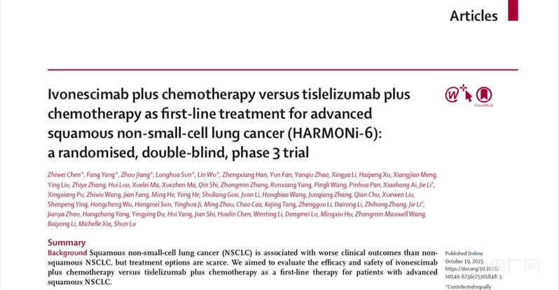 10月19日,相關(guān)成果在國際學(xué)術(shù)頂刊《柳葉刀》(The Lancet)發(fā)表。同日,該研究還作為最新突破性摘要(LBA),在2025年歐洲腫瘤內(nèi)科學(xué)會(ESMO 2025)大會上進(jìn)行發(fā)布。該研究探索了全球首創(chuàng)“腫瘤免疫+抗血管生成”雙特異性抗體——依沃西單抗聯(lián)合化療一線治療晚期鱗狀非小細(xì)胞肺癌的療效和安全性,開啟了晚期肺鱗癌治療的新格局。