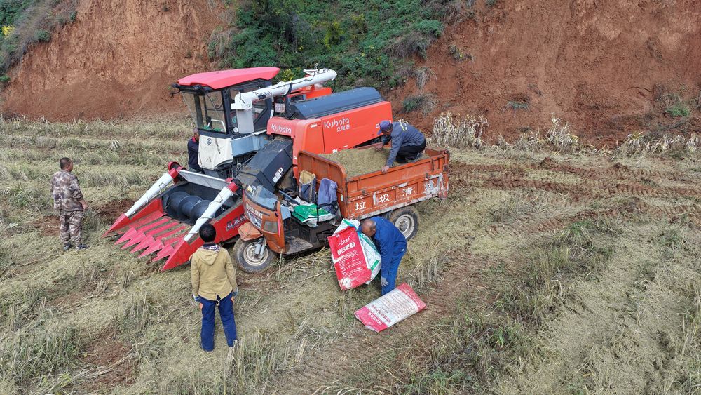 而在沁州黃鎮(zhèn)后底溝村,搶收戰(zhàn)場(chǎng)則傳來了機(jī)器的轟鳴聲。面對(duì)全村500畝左右的谷子收割任務(wù),以及雨后部分地塊依然泥濘、人工收割效率低、大型輪式機(jī)械容易下陷的難題,后底溝村充分發(fā)揮農(nóng)業(yè)機(jī)械的作用,使用了適應(yīng)性更強(qiáng)的履帶式收割機(jī)進(jìn)行作業(yè)。只見這些鋼鐵“戰(zhàn)士”在濕軟的土地上穩(wěn)健前行,靈活穿梭于谷壟之間,所過之處,谷穗被整齊地“吞”入,金黃的谷粒則被快速“吐”進(jìn)集糧倉,秸稈也被同步粉碎還田。機(jī)械化作業(yè)極大地提升了收割效率,解決了泥濘地人工難以下腳、進(jìn)度緩慢的燃眉之急。