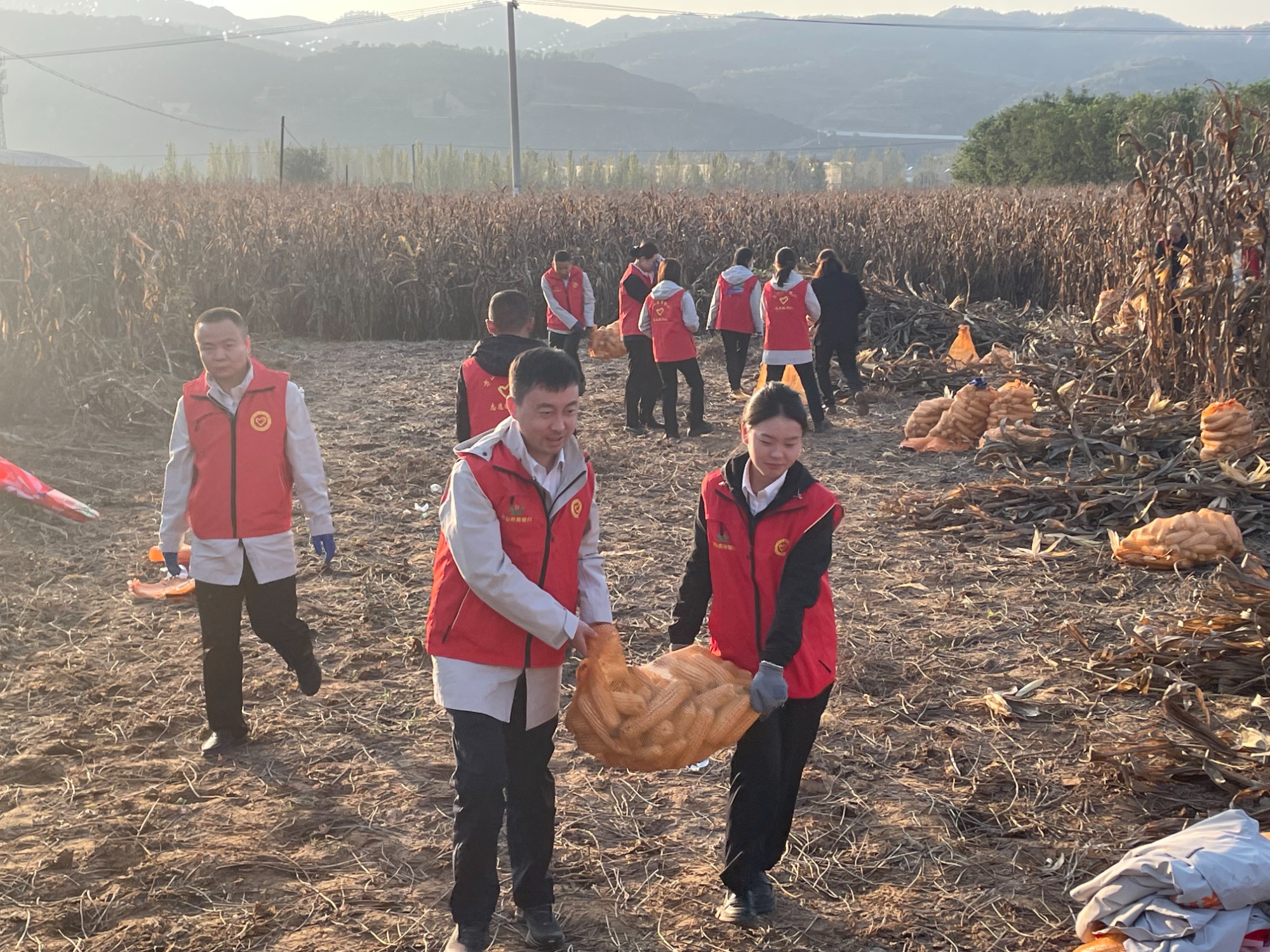 在圪洞鎮(zhèn)潘家坂村的玉米地里,身著紅馬甲的駐村干部與志愿者們正俯身勞作(方山融媒供圖)