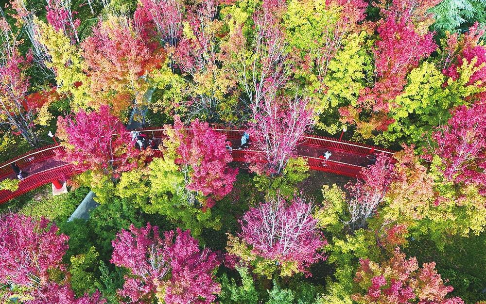 眼下正值楓葉觀賞期,在西安幸福林帶內(nèi),紅、黃、綠色的楓樹葉片交織如畫,引來市民游客打卡拍照,沉浸式享受秋日浪漫。圖為10月15日航拍的西安幸福林帶“楓”景如畫。(記者 代澤均 攝)