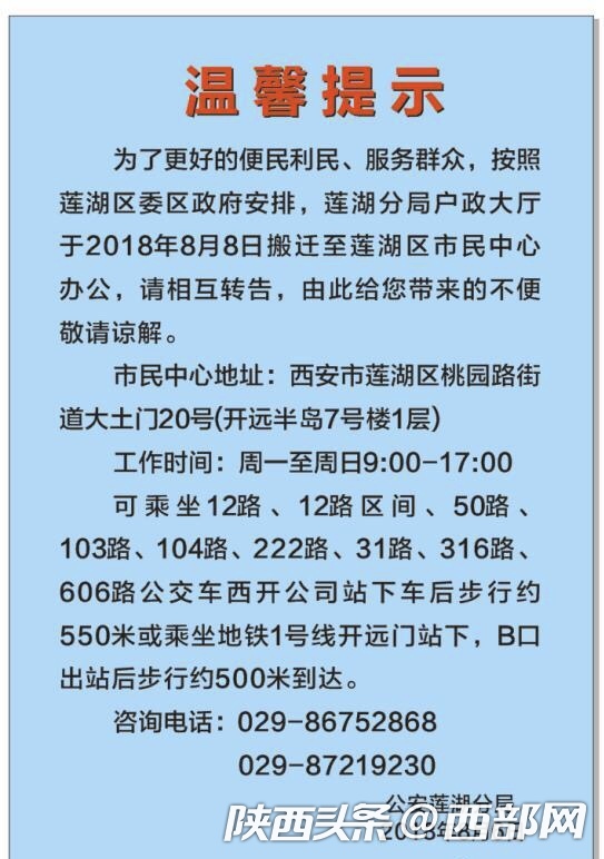 據(jù)悉,為了更好的便民利民、服務(wù)群眾,按照蓮湖區(qū)委區(qū)政府安排,蓮湖分局戶政大廳將搬往西安市蓮湖區(qū)桃園路街道大土門20號(開遠(yuǎn)半島7號樓1層),工作時間為周一至周日9:00-17:00。