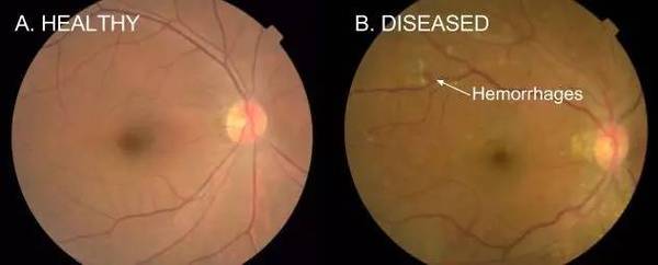 圖 1:為了篩選 DR 而拍攝的視網(wǎng)膜眼底照片樣本。左側(cè)的圖像是健康的視網(wǎng)膜(A),而右邊的圖像則是可引起糖尿病性視網(wǎng)膜病變的視網(wǎng)膜(B),可以看到存在出血狀況(紅點(diǎn))。