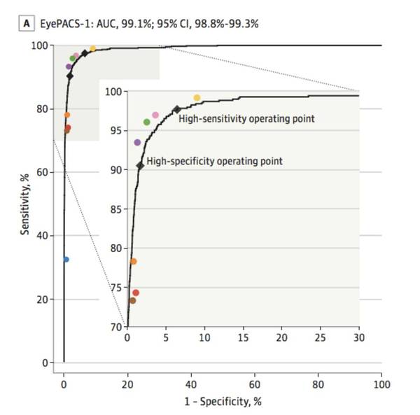 圖 2. 算法性能(黑色曲線)和八位眼科醫(yī)生(彩色圓點(diǎn))在由9963個(gè)圖像組成的驗(yàn)證集上判斷病變,即判斷是否存在可引起的糖尿病性視網(wǎng)膜病變(中度或更嚴(yán)重的糖尿病性視網(wǎng)膜病變或可疑的糖尿病性黃斑水腫)。圖上的黑色方塊對(duì)應(yīng)在高靈敏度和高特異性操作點(diǎn)中,算法的靈敏度和特異性。