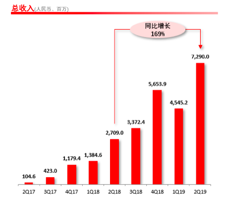 北京時(shí)間8月21日,新電商平臺(tái)拼多多(NASDAQ:PDD)發(fā)布了2019年第二季度財(cái)報(bào)。財(cái)報(bào)顯示,截至2019年6月30日的12個(gè)月期間,平臺(tái)GMV達(dá)7091億元,較去年同期的2621億元同比增長171%;二季度,拼多多實(shí)現(xiàn)營收72.90億元,較去年同期的27.09億元同比增長169%,較今年一季度的45.452億元,環(huán)比增長60%。