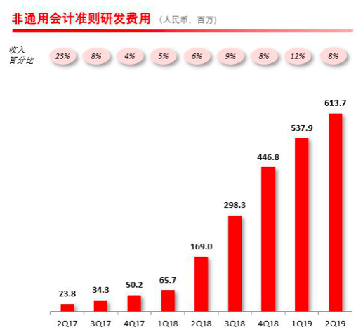 ▲2019年第二季度,拼多多研發(fā)費(fèi)用攀升至8.037億元,同比增長332%。平臺(tái)研發(fā)費(fèi)用占收入比為11%,高于行業(yè)平均水平。