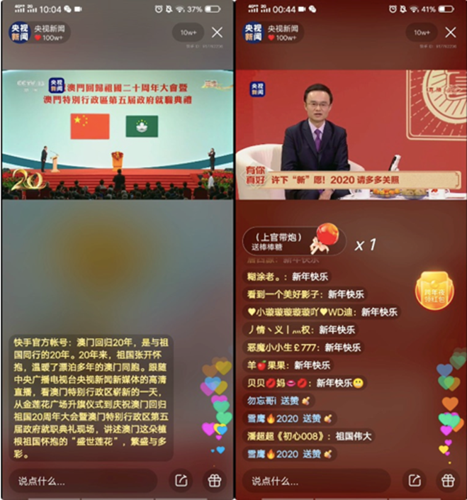 在澳門回歸祖國20周年之際,快手聯(lián)合央視新聞進(jìn)行了6場系列直播,累計(jì)觀看人次超過4000萬;跨年夜,央視新聞推出“有你真好”特別節(jié)目,在快手號(hào)全程同步直播,直播答題互動(dòng)形式也首次出現(xiàn)在央視跨年特別節(jié)目中,累計(jì)觀看人數(shù)1.4億。