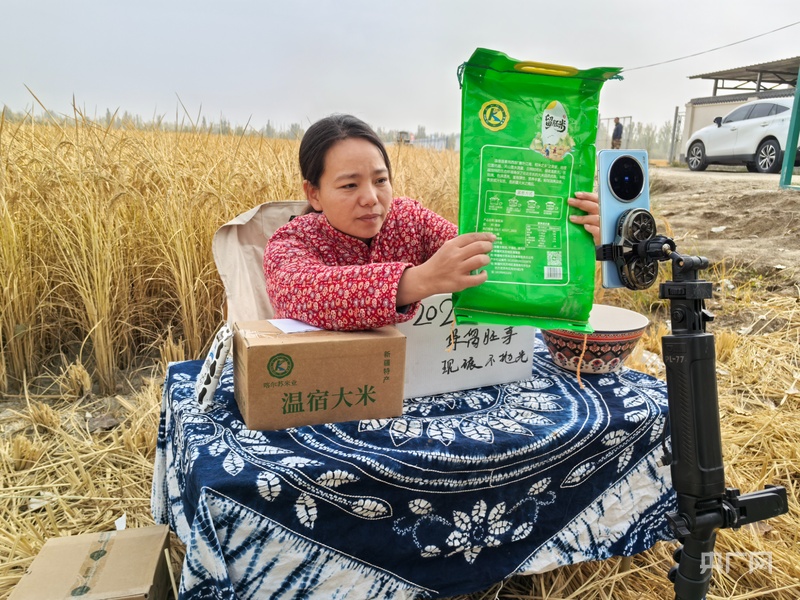 工作人員通過線上直播銷售溫宿大米 (央廣網(wǎng)記者丁安 攝)